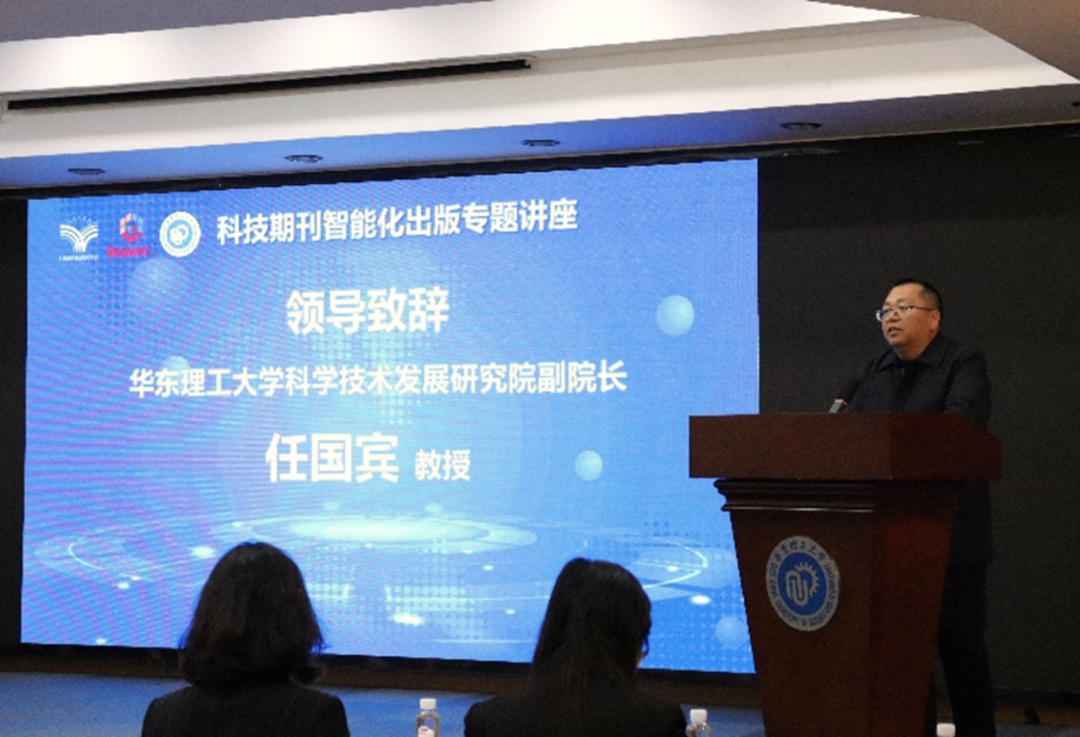 华东理工大学科学技术发展研究院副院长任国宾教授致辞,介绍了华东理工大学在科技创新与学术期刊建设方面的成果,指出人工智能(AI)技术为期刊出版带来深刻变革,期待本次讲座能激发更多创新思路与实践,并预祝活动取得圆满成功。